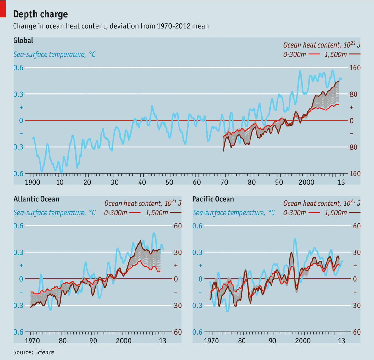 http://en.wikipedia.org/wiki/Satellite_temperature_measurements What Determines Earth’s Climate? 1999-2012 flattening temperaturesOVER the past few years one of the biggest questions in climate science has been why, since the turn of the century, average surface-air temperatures on Earth have not risen, even though the concentration in the atmosphere of heat-trapping carbon dioxide has continued to go up. This “pause” in global warming has been seized on by those sceptical that humanity needs to act to curb greenhouse-gas emissions or even (in the case of some extreme sceptics) who think that man-made global warming itself is a fantasy. People with a grasp of the law of conservation of energy are, however, sceptical in their turn of these positions and doubt that the pause is such good news. They would rather understand where the missing heat has gone, and why—and thus whether the pause can be expected to continue. The most likely explanation is that it is hiding in the oceans, which store nine times as much of the sun’s heat as do the atmosphere and land combined. But until this week, descriptions of how the sea might do this have largely come from computer models. Now, thanks to a study published in Science by Chen Xianyao of the Ocean University of China, Qingdao, and Ka-Kit Tung of the University of Washington, Seattle, there are data. Dr Chen and Dr Tung have shown where exactly in the sea the missing heat is lurking. As the chart below shows, over the past decade and a bit the ocean depths have been warming faster than the surface. This period corresponds perfectly with the pause, and contrasts with the last two decades of the 20th century, when the surface was warming faster than the deep. The authors calculate that, between 1999 and 2012, 69 zettajoules of heat (that is, 69 x 1021 joules—a huge amount of energy) have been sequestered in the oceans between 300 metres and 1,500 metres down. If it had not been so sequestered, they think, there would have been no pause in warming at the surface. Hidden depthsThe two researchers draw this conclusion from observations collected by 3,000 floats launched by Argo, an international scientific collaboration. These measure the temperature and salinity of the top 2,000 metres of the world’s oceans. In general, their readings match the models’ predictions. But one of the specifics is weird. Most workers in the field have assumed the Pacific Ocean would